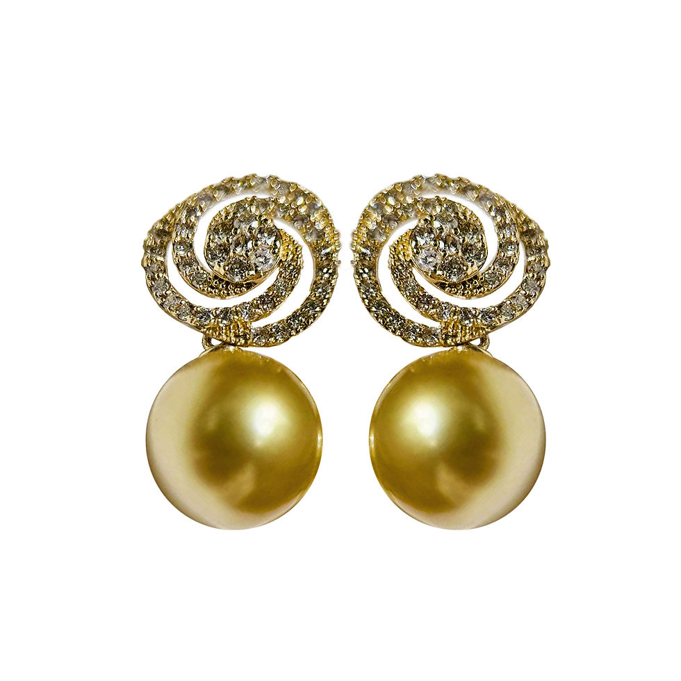 Crown Radiance — 12-13mm Golden South Sea Pearl & Diamond Spiral Earrings