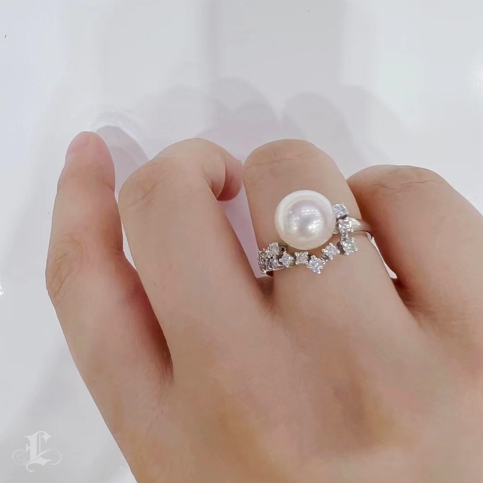 Lustre Arc — Akoya Pearl Ring with Diamond Bow, 9–9.5 mm AAA Rose Overtone